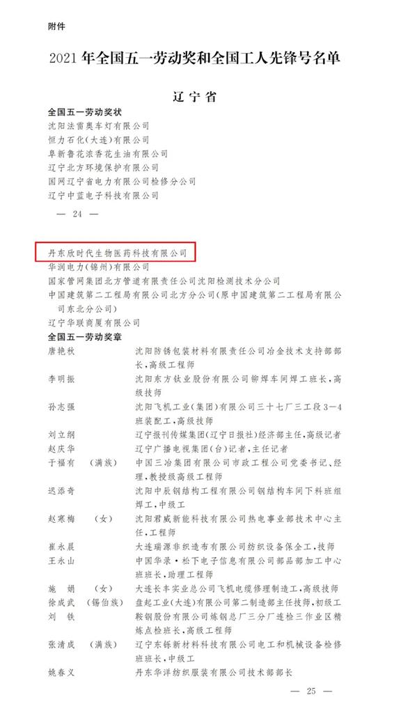 丹東欣時代生物醫(yī)藥科技有限公司被中華全國總工會授予“2021年全國五一勞動獎狀”。